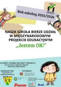 Od 1 listopada 2025r. do 31 stycznia 2026r. uczniowie klasy 1c będą realizowali międzynarodowy projekt edukacyjny „Jestem OK!”, który wspiera rozwój dzieci poprzez budowanie poczucia wartości, umiejętność stawiania granic, wzmacnianie relacji rówieśniczych i podnoszenie świadomości na temat bezpieczeństwa oraz wzajemnego szacunku.