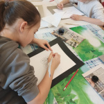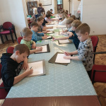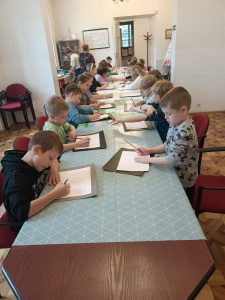 Skryby – pisanie gęsim piórem. Mają na celu przybliżenie pracy skryby-zakonnika przepisującego ręcznie księgi. Uczniowie po krótkim wprowadzeniu otrzymali gęsie pióra i na podstawie przygotowanych wzorów kreśli i zdobili średniowieczne litery. Ta umiejętność była bardzo trudna i żmudna, uczyła dużej cierpliwości. Powstały piękne inicjały.