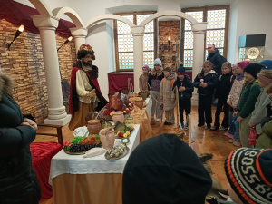 Wiecie, że byli dużo niżsi od nas, a średnia wieku to 30 lat? Niesamowite historie Pani Przewodnik opowiadała na wystawie czasowej „Co jadano w czasach Bolesława Chrobrego?”. Wizualizacja suto zastawionego stołu, pomogła nam dostrzec, czym ludzie żywili się w dawnych czasach. Dowiedzieliśmy się jakie zboża uprawiali nasi przodkowie we wczesnym średniowieczu oraz jakimi jeszcze roślinami uprawnymi i dziko rosnącymi, warzywami, owocami i mięsem, których zwierząt, urozmaicali swe memu. Wiecie, że jeszcze wtedy nie było chleba? To podpłomyki i dary natury żywiły ludność tamtych czasów: ryby, leśne zwierzęta, a nawet bobry!