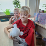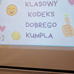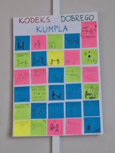 Maskotka misia – pomocnika ułatwiała zabieranie głosu. Ćwiczenia na rozróżnianie informacji o tym, co czuję, co słyszę pokazały dzieciom, że słowa ranią tak samo mocno jak ciosy fizyczne. Budowanie relacji w klasie na pewno nie jest prostym zadaniem, ale wiemy już od czego warto zacząć budować fundament pod silny zespół. Na zakończenie spisaliśmy kodeks dobrego kumpla, który pomoże nam przestrzegać zasad w klasie.